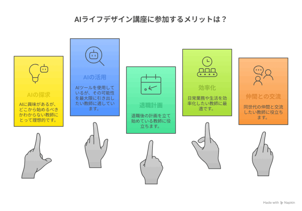 下の図は、Napkin AIで作成した「AIを活用したライフデザインサイクル」です。参考にしていただければ幸いです。